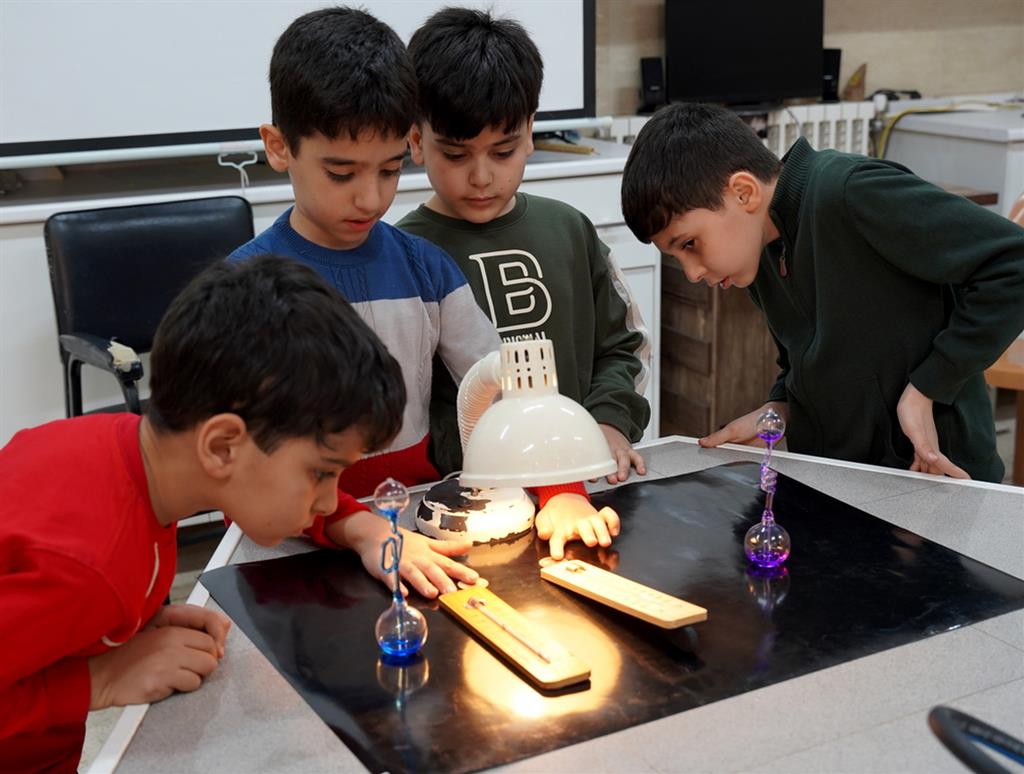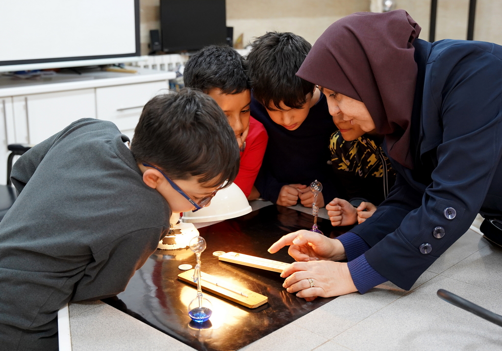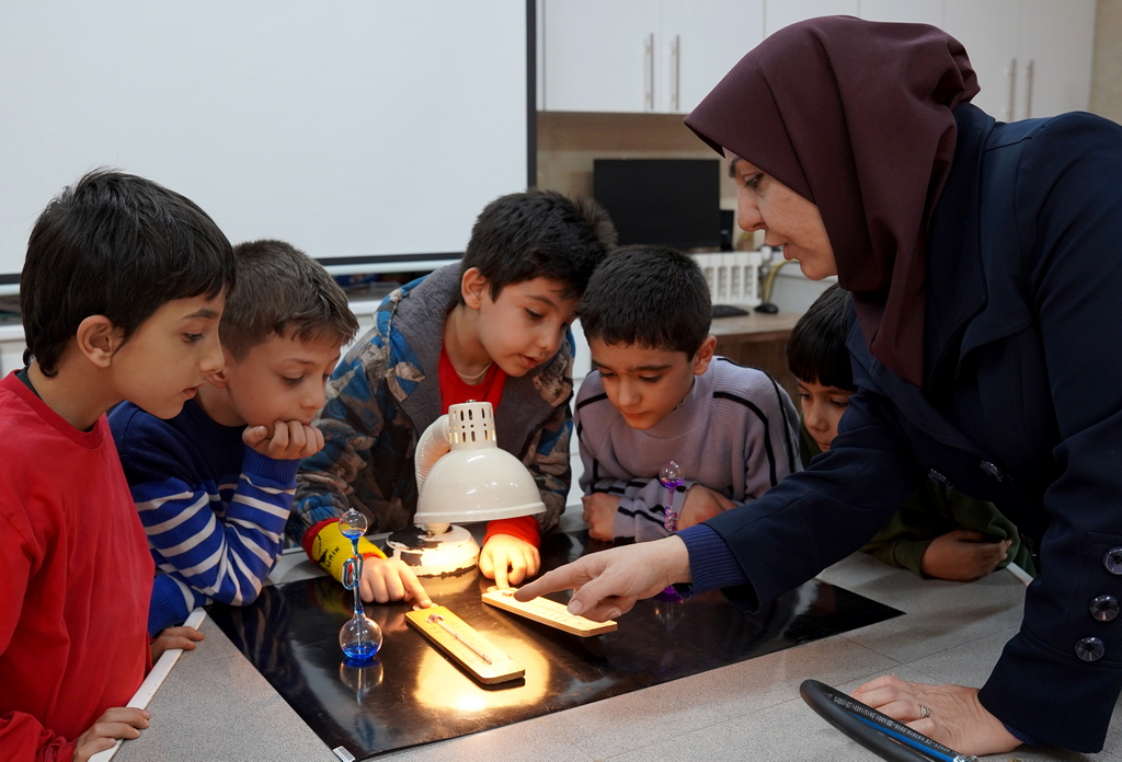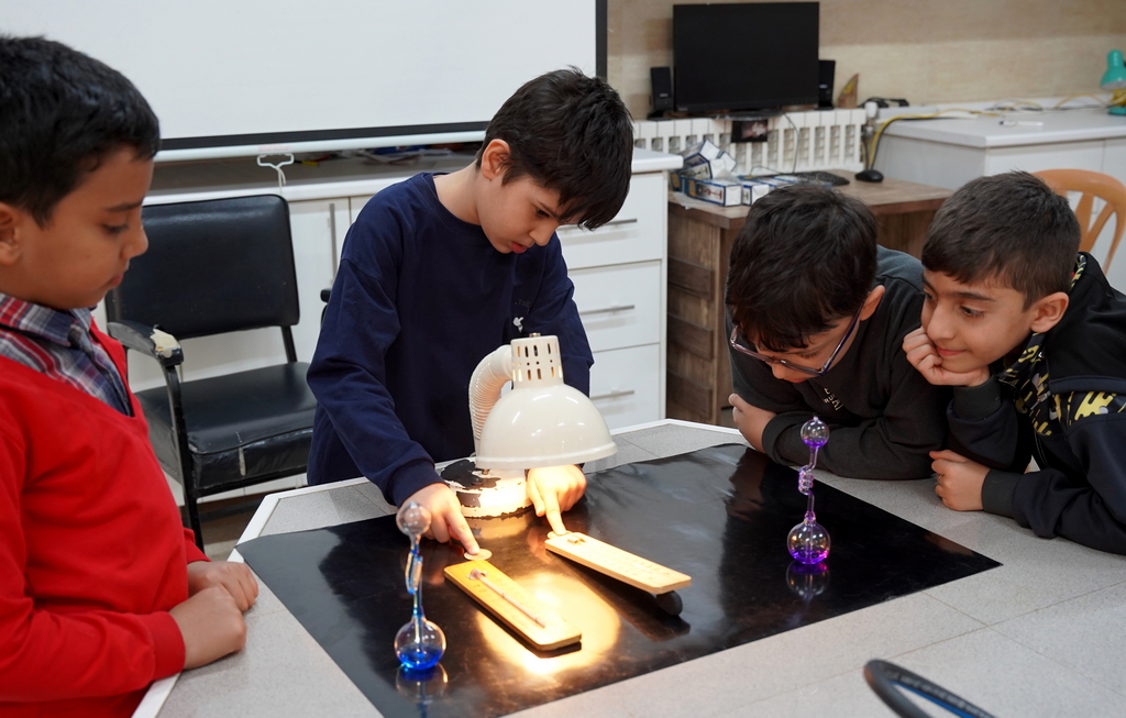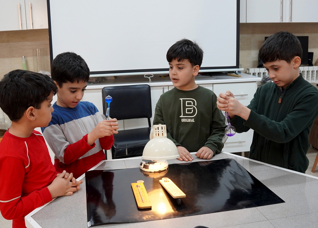 آزمایش تأثیر زاویه نور بر گرما با استفاده از دو سکه انجام شد که نور یک چراغ مطالعه به صورت مستقیم و مایل بر روی آن‌ها تابانده شد. دانش‌آموزان پس از چند دقیقه، با گذاشتن انگشت اشاره بر روی هر دو سکه، میزان گرمای جذب شده را مقایسه کردند. در موازات این بررسی، دو دانش‌آموز دو دماسنج را در دست خود نگه داشتند و مشاهده کردند که بر اثر حرارت کف دست، مایع درون دماسنج به سمت بالا حرکت می‌کند (نشانه‌ای از افزایش گرما). نتیجه نهایی آزمایش این بود که تابش نور راست (مستقیم) منجر به هوای گرم‌تر (تابستان) و تابش مایل منجر به هوای سردتر (زمستان) می‌شود.